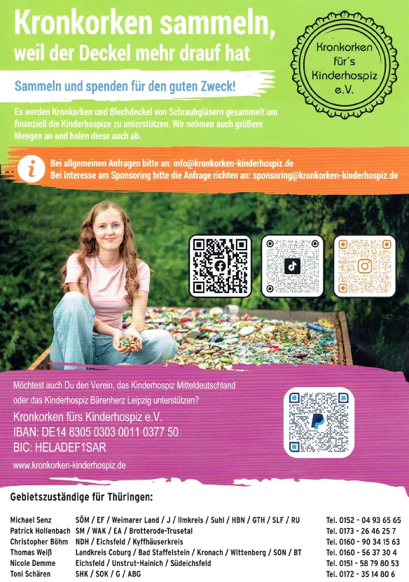 Die Sammelaktion konzentriert sich auf die Beschaffung von Kronkorken, Blechdeckeln von Schraubgläsern und Flaschendeckeln aus Metall. Diese scheinbar alltäglichen Gegenstände werden gesammelt, um einen wichtigen Beitrag zur finanziellen Unterstützung des Kinderhospitz Mitteldeutschland zu leisten. Durch die Mobilisierung der Gemeinschaft für einen wohltätigen Zweck erlebt die Sammelaktion eine beeindruckende Resonanz.
